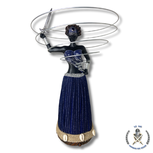 Os adornos em espiral e a espada reforçam o caráter de proteção, disciplina e justiça, tornando esta peça ideal para altares, congás, casas religiosas e espaços de devoção. Uma imagem de forte presença espiritual, indicada para praticantes e devotos das religiões de matriz africana.