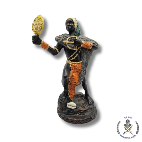 Encante-se com a representação de Logunedé, o príncipe das águas e das matas. Esta peça em resina captura a essência única deste Orixá, que herda a maestria da caça de seu pai, Oxóssi, e a vaidade e o encanto de sua mãe, Oxum.