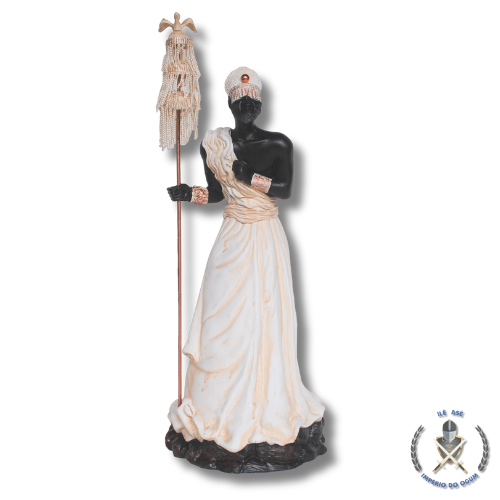 Esta imponente imagem de Oxalá, com 40 cm de altura, representa o Orixá maior, símbolo da fé, da paz, da criação e da sabedoria divina nas religiões de matriz africana. Oxalá é associado à harmonia, à espiritualidade elevada e à força que rege o equilíbrio entre o céu e a terra.