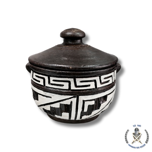 Seu acabamento artesanal apresenta grafismos africanos tradicionais, que representam proteção, equilíbrio e axé, tornando a panela uma peça de grande valor simbólico e espiritual. Por ser um modelo tamanho 2, oferece maior capacidade, sendo ideal para trabalhos que exigem mais elementos ritualísticos.